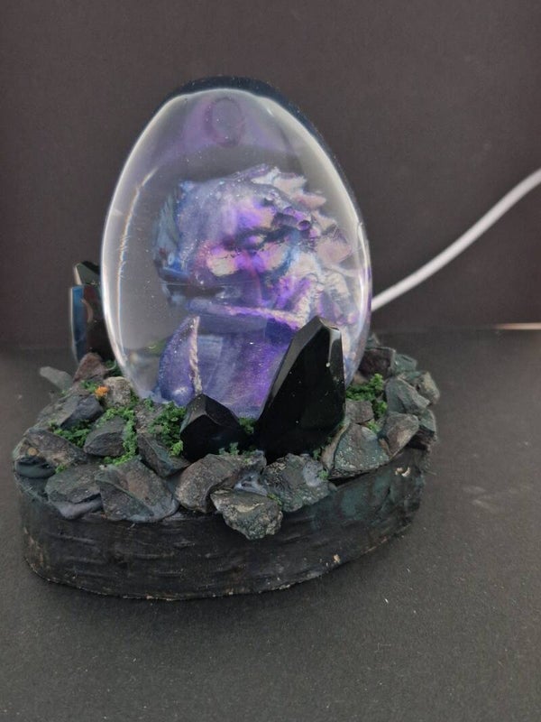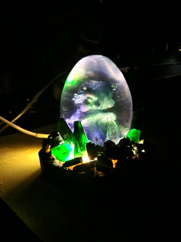Een betoverend, doorzichtig drakenei van epoxy met een zichtbaar miniatuur draakje in metallic kleuren. Rondom het ei zijn echte stenen en edelstenen van epoxy, wat het geheel een mystieke uitstraling geeft.