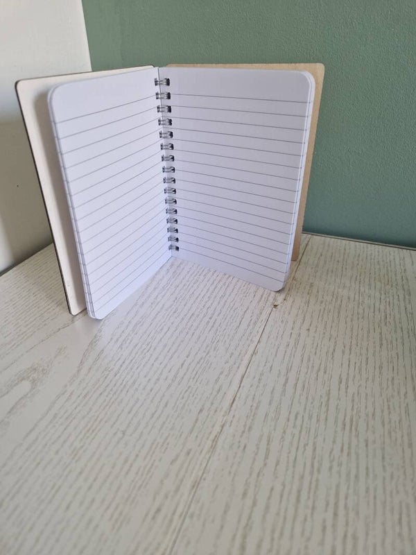 Een compact notitieboekje met een stijlvolle houten kaft, versierd met een speels uitgesneden afbeelding. De achtergrond wordt verfraaid met een kleurrijk effect, wat zorgt voor een uniek design.